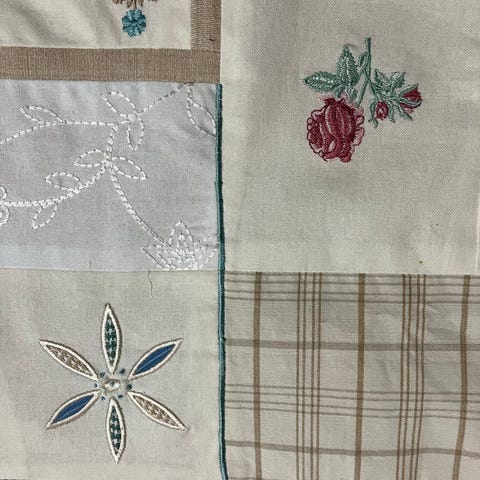 Tilkkutyökirja ja iso ruskea kangaspala/verho