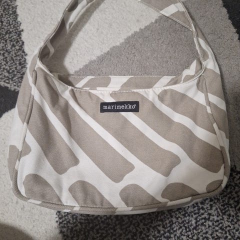 Myydään Marimekon olkalaukku/käsilaukku. Ei erillisiä olkahihnoja. Muuten hyvässä kunnossa, vuorikin ehjä, mutta värit haalistuneet kantohihnoista.