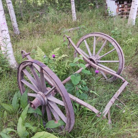 Vanha rautainen pyörän vannepari, jossa on metalliset pinnat ja keskukset. Soveltuu korjaus- tai koristekäyttöön. Vanteet ovat kuluneessa kunnossa ja niissä näkyy ruostetta.