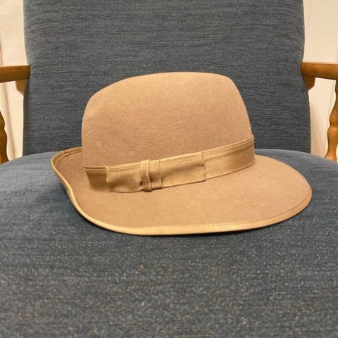 Tummanruskea lakki / myssy. Pieni samanvärinen ruusuke sivussa. 80 prosenttia angoraa ja 20 prosenttia polyamidia. Koko noin 57.