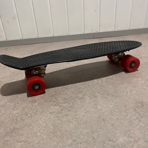 Myydään rullalauta. Pyörissä välkkyy valot rullaillessa.