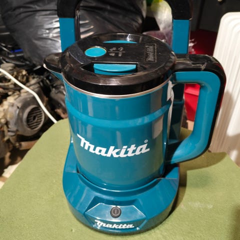 Makita Cordless Kettle langaton vedenkeitin, joka toimii 18V ja 36V litiumioniakuilla. Vedenkeitin on suunniteltu käytettäväksi ilman verkkovirtaa, ja sen rakenne sisältää kätevän kahvan ja kantokahvan. Sopii ulkokäyttöön tai paikkoihin, joissa ei ole sähköpistoketta.