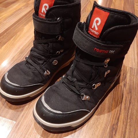 Reima lasten talvikengät, koko 38, musta väri. Sopivat unisex-käyttöön. Kengät on suunniteltu tarjoamaan suojaa ja mukavuutta kylmissä olosuhteissa.
