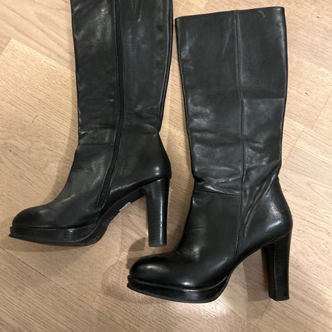 Zinda mustat nahkasaapikkaat, koko 38. Takana vetoketju. Vähällä käytöllä olleet, siistit. Pohja ei kovin pitävä, joten näille keleille sopivat.