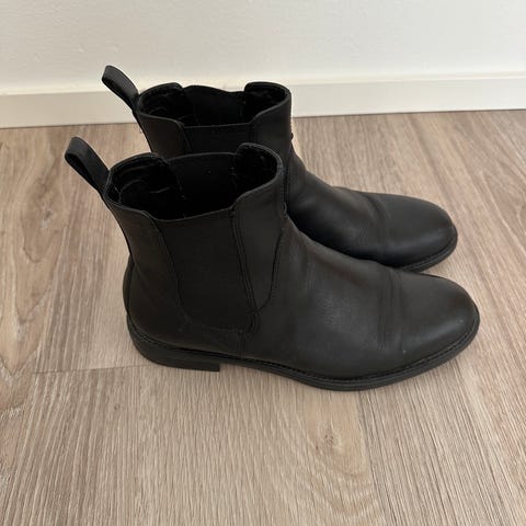 Vagabond Amina-malliset nilkkurit mustaa nahkaa, koko 38. Saappaissa on vetoketju ja solki sivulla, matala korko ja pyöreä kärki.