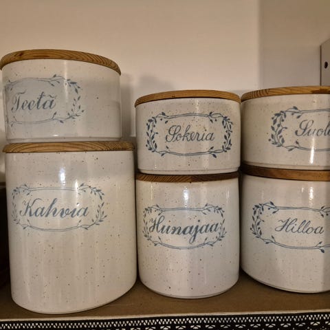 Hyväkuntoiset Pentikin Hallasarjan astiat. Lisäksi voirasia ja maljakko.