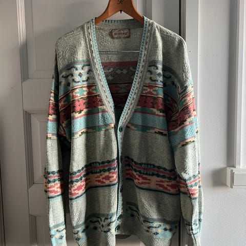 Kaunis ja laadukas Detti-merkkinen vintage neule Unkarista. Neuleessa on upea pitsimäinen, geometrinen kuosi ja klassinen nappikiinnitys. Vaalea luonnonsävy tekee siitä helpon yhdistää eri asuihin. Materiaaliseos tekee pinnasta pehmeän, hengittävän ja kevyen, täydellinen kerrospukeutumiseen. Kokolappu on haalistunut, arvioitu koko noin EU 2XL.