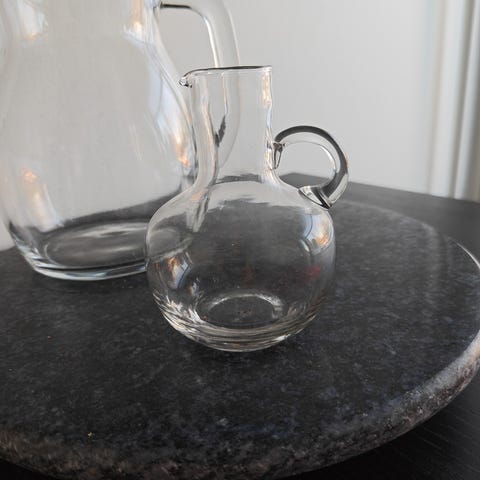 Kaunis vedenvihreä lasinen kaadin, jossa on korkki. Korkissa on vähän tunkkainen haju, joten pitäisin sen erillään elintarvikkeista. Ilman korkkia toimii hyvin tai sen kanssa koristeeksi. Kaatimen korkeus 13,5 cm.