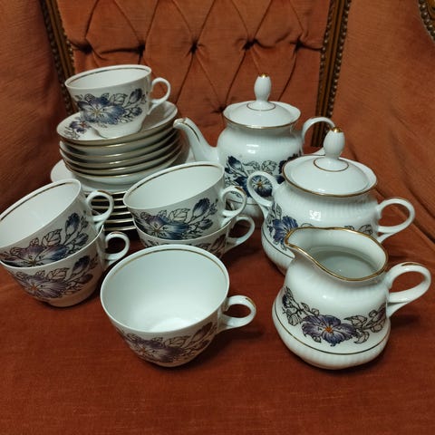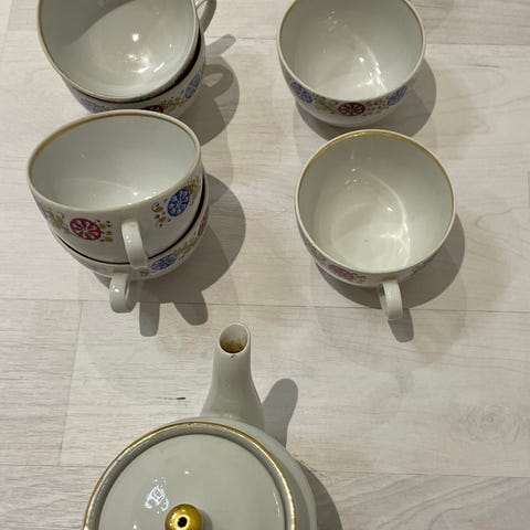 Kaunis Regina astiasto posliinia käsin maalattu. 6 teekuppia, teekannu ja sokerikko. Kullattut reuna. Valmistaja Lefard. Klassinen astiasto Yht: 25€