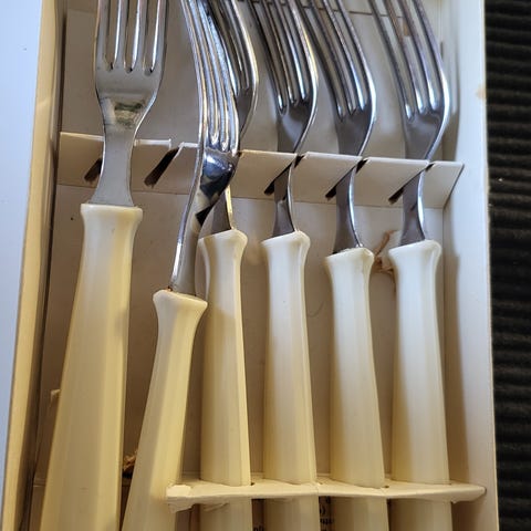 Ruotsalaiset haarukat ja veitset. Ruostumaton teräs/muovi. Molempia 6kpl. Kunto hyvä, yhden haarukan muoviosassa on pieniä jälkiä (kuva).