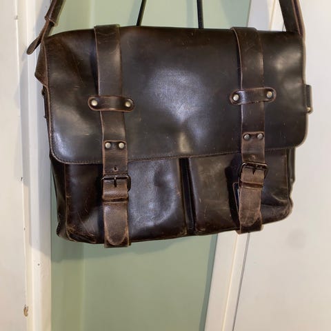 Ruskean harmahtava Bartuggi-merkkinen nahkainen ja kestävä laukku jossa useampi tasku.