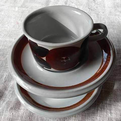 Arabia She-Foo -mokka-astiasto, joka on valmistettu noin vuosina 1926–1932. Astiaston on suunnitellut Friedl Kjellberg ja koristelun on tehnyt Olga Osol. 2kpl kuppeja + lautaset