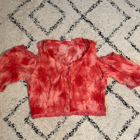 Puuteriroosan värinen hihaton/ pienillä hihoilla pusero pitsimäisellä yläosalla.