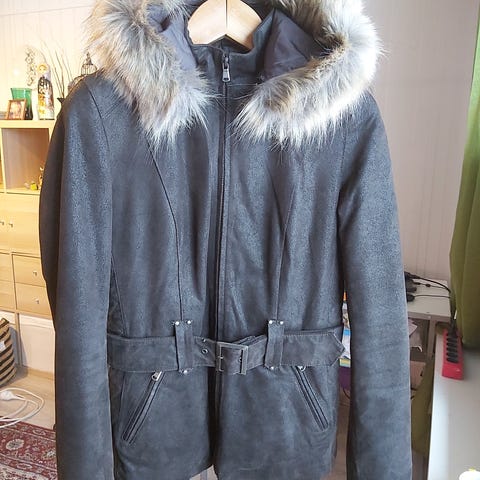Pitkä sinimusta mokkanahkatakki hupulla ja aidoilla turkisyksityiskohdilla. Koko reilu S.