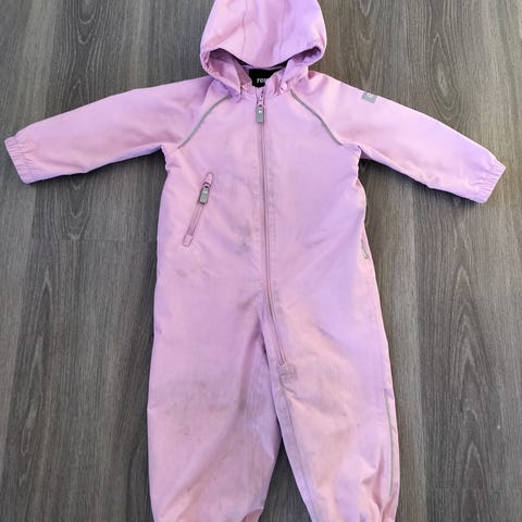 Reiman vaaleanpunainen vk-haalari, koko 92, malli Takaisin ja väri rose blush. Vaaleaan väriin jäänyt joitain jälkiä jotka eivät lähteneet perus pesussa, tahranpoistoa en ole kokeillut (ks. kuvat). Muuten haalari on ehjä ja yleisilmeeltään edelleen siisti.