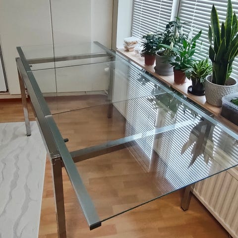 Tyylikäs ja moderni maitolasipöytä metallijaloilla, johon voi mahtua 2-4 ruokailijaa. Helppo pitää puhtaana ja sopii moneen sisustukseen. Ollut käytössä tietokonepöytänä. Mitat: L110 x S75 x K73 cm.