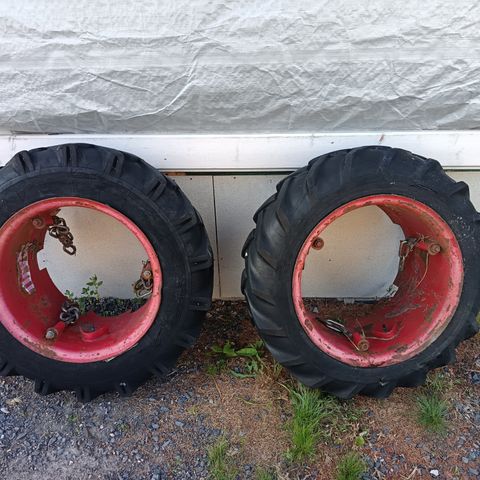 Paripyörät 18.4 - 34", ilmat sisällä, kumit kelvottomat. Välivanteet ja ketjut.