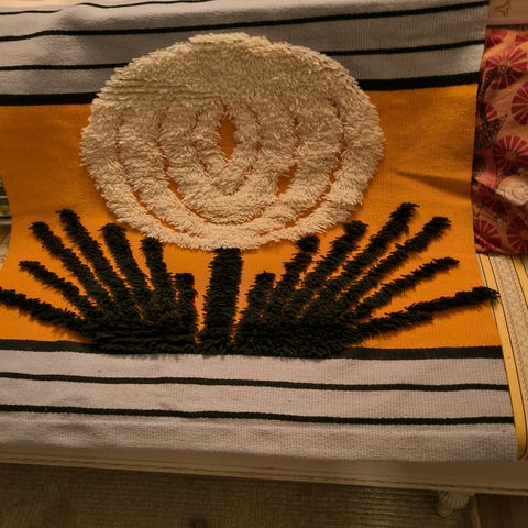 Pirteä poppana, käytännössä kuin uusi. Mustaa, oranssia keltaista, valkoista ja burgundia iloisina raitoina. Materiaali villaa