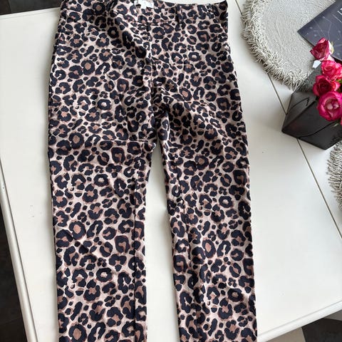 Siistit ja hyväkuntoiset leopardihousut niin olohousuiksi kuin pyjamaksikin. Taskut molemmilla puolilla sekä koristeena narut vyötäröllä, jotka eivät sitä kuitenkaan kiristä. Vyötäröllä joustava kuminauha.