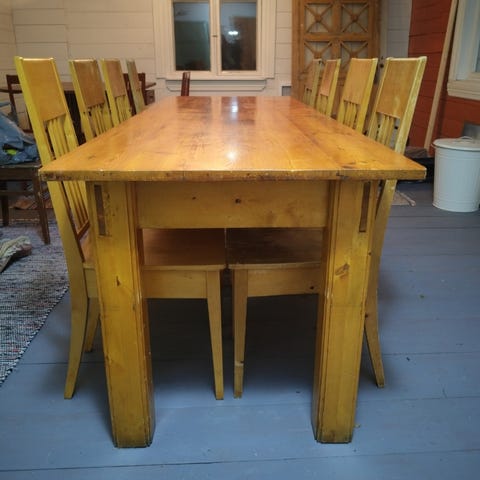 Vanha, n 100v, erittäin tukeva ja vahvaa puuta oleva ruokailuryhmä. Puusepän tekemät.Avattava puusohva jolloin siitä saadaan sänky kahdelle, 4 tuolia ja pöytä, missä. avattavat sivuosat ja 2 laatikkoa pöydän alla. Kaikki ehjiä, eivät heilu vaan ovat tosi hyvässä kunnossa. Siniseksi maalattu ryhmä. Alkuperäinen väri vanha vihreä.