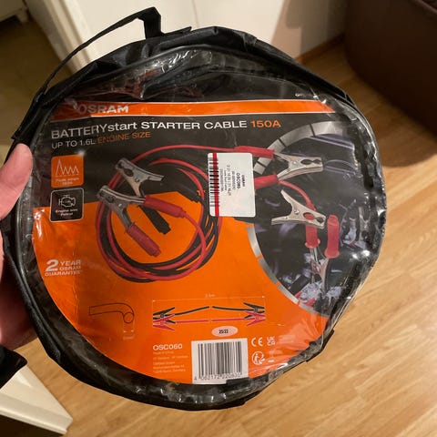 Starttikaapelit, pituus 2,5 metriä. Kaapelit on suunniteltu akkujen käynnistämiseen ja sisältävät puristimet kummassakin päässä. Väri oranssi ja musta.