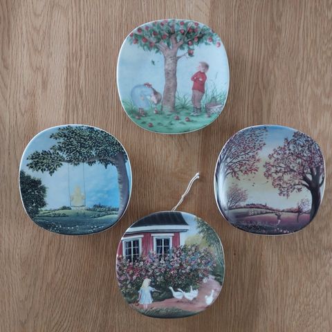 Arabia seinälautaset: syksyn värit saaristossa, talven hiljaisuus saaristossa, kotiseudun kesä ja kielo. Lautasten koko.n. 12 cm x 12 cm. Hinta yksittäin 8€/kpl, kaikki neljä yhdessä 26€. Postikulut ostajalle.