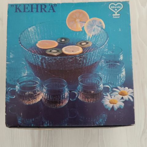 Riihimäenlasin Kehrä boolimalja+8 boolimukia. Hinta 27€. Postikulut ostajalle, nouto Inkoo tai kulkeutuu omien menojen mukaan välillä Inkoo-Hki.