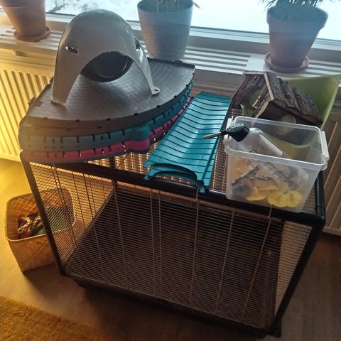 Клетка помыта, крепкая, состояние хорошее. Из недочетов: этажи со следами использования, несколько этажей требуют лестниц (можно использовать деревянные лестницы или мостики). Подходит для крупных грызунов.