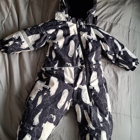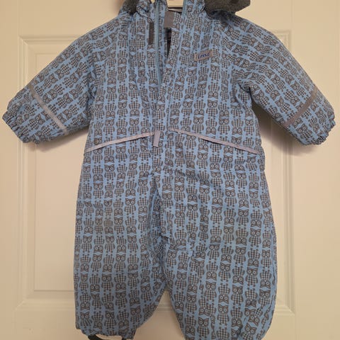 Lämmin, ehjä ja muhkea haalari, reilua kokoa. Jonkin verran tummentumaa, näkyy kuvissa. Hyvä vaikka päiväkotiin vielä!
