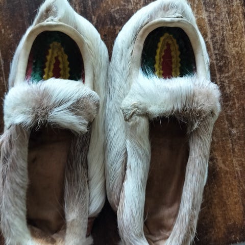 Söpöt porotossut. Koosta ei muistikuvaa, mutta pohjan pituus noin 12 cm. Ollut meillä käytössä noin 1v ikäisellä. Hyvä käytetty kunto.