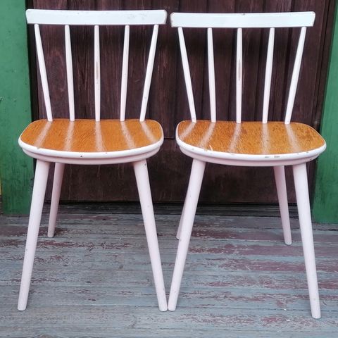 Vanhat, tukevat pinnatuolit. Alunperin ruskeat, osaksi maalattu valkoiseksi. Kaipaa ehkä uudelleen maalausta. Hinta 25€ / kpl.