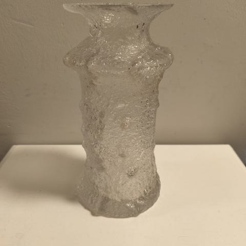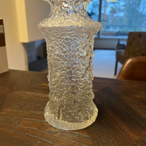 Iittala Rubus maljakko v. 1968-1970. Kaulassa sisäreunasta pieni pala/murunen pois. Tätä ei edes huomaa, että ei näköä eikä käyttöä haittaa mitenkään. On huomaamaton, kun lasi on tuollaista. Upea vanha maljakko kunnoltaan kuin uusi olisi. Timo Sarpanevan suunnittelema. Pohjassa signeeraus TS. Korkeus 22 cm. Hinta on edullinen.