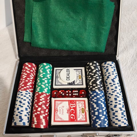 Myydään lähemmäs käyttämätön pelisalkku pelimerkkeineen ja tarvikkeineen.