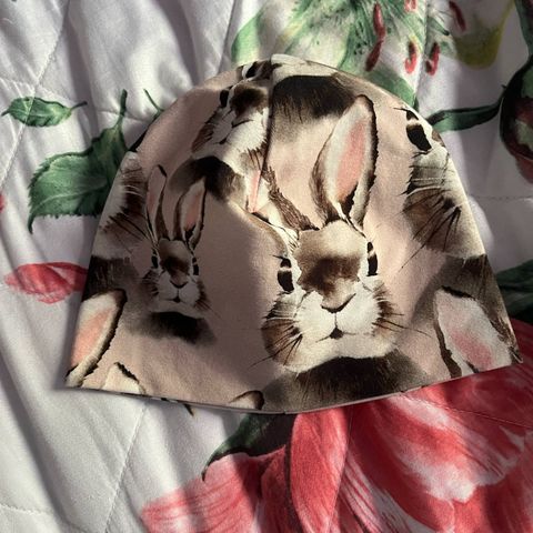 Pop&co pipo kaksinkertaista puuvillatrikoota. Koko 2, päänympärys venyttämättä n. 53 cm. Kankaan kuosissa mm. yksisarvisia. Hyväkuntoinen, hieman pesuhaitua pinnassa ja vuoressa pieni tahra (kuva).