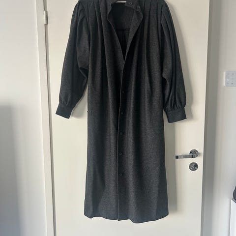 Ritva Fallan Marimekolle suunnittelema tuhti, keittovillainen takki kauniissa luonnonvaaleassa sävyssä. Kokomerkintä kulunut, mutta malli on väljä ja passaa halutusta istuvuudesta riippuen monelle.