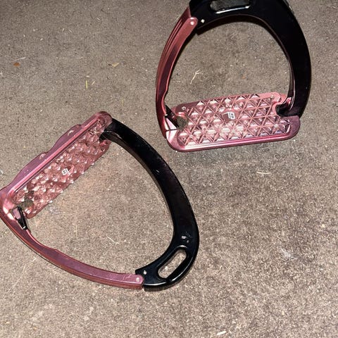 Hyväkuntoiset jalustimet turvamekanismilla. Näitä ei myydä suomessa. Tilattu täältä: https://www.cowgirlstore.nl/product/aluminium-veiligheidsbeugels-ez-out/. Mukaan vaihtokumit.