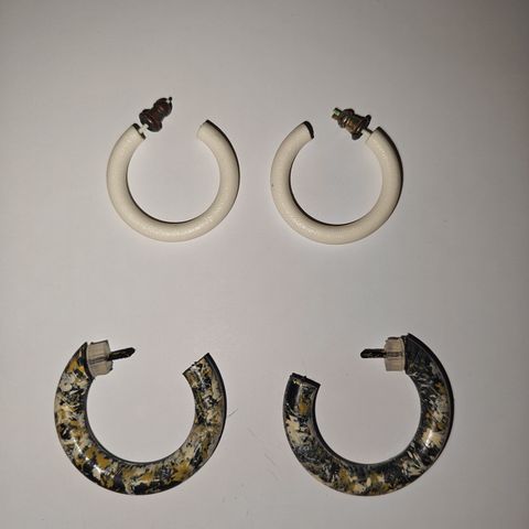 Setti vanhoja koruja. Kaksi rannerengasta, halk. n. 6,5 cm ja kaulakoru, pituus n. 63 cm, materiaali muovia. Ja kahdet korvakorut, klipsimalliset eli ei tarvitse reikiä. Yhteishintaan 3e. Nouto tai postitus (+6,90e).