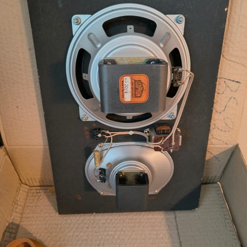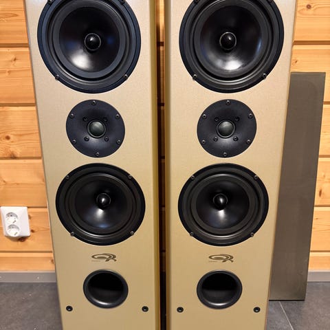 Hifitalon esittelypari ja puusepän tekemät jalustat. Ehjät ja siistit. Nykyiseen kuuntelutilaan liian suuret