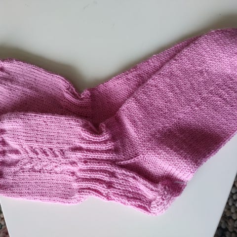 Neulottu 7-veljestä langasta. Pohjan pituus 24,5 cm.
