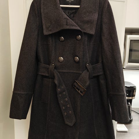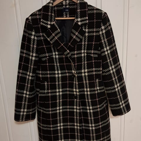 Musta-valkoruudullinen villakangastakki, villaa 45 %, koko M/40, ns. tyköistuva malli, napit hieman löysällä, olka-helma pituus 85 cm, kai-kai 50.