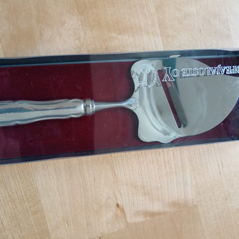 Lahjapakkauksessa oleva uusi hopeinen Chippendale juustohöylä puutarjottimella. Käyttämätön.