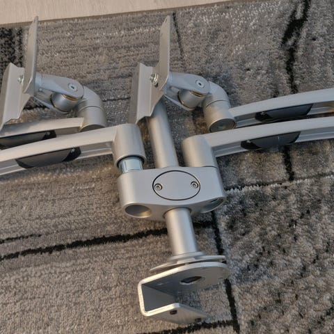 Myynnissä jämäkkä ja helppokäyttöinen monitovarsi kahdelle näytölle.