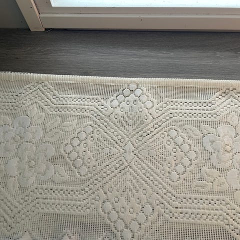 Kaunis käsin virkattu kappa pitsiverho.