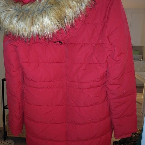Korkea kaulus jossa vakosamettivuori, kestävä vetoketju, liukas sisävuori, povitasku, vetoketjulliset taskut, takana kahden eri asteen vyötärökiristys (kuvissa tiukimmalla säädöllä) ja levitettävä helma. Hihoissa ihanat sisäresorit. Pitää todella hyvin tuulta ja sadetta. Kestävänoloinen ulkokangas.