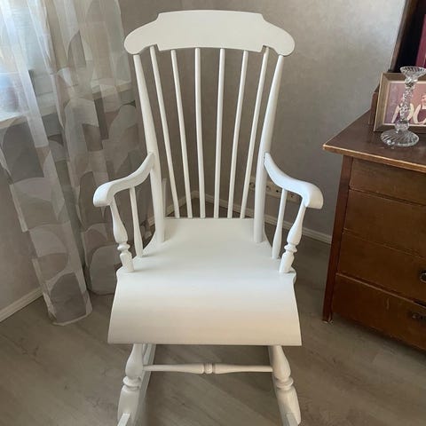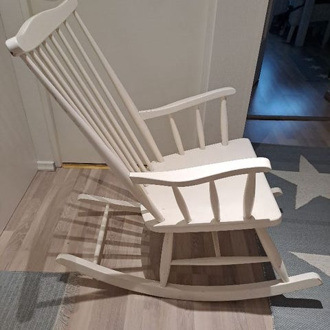 Hyvä istua ja keinua. Jos hakee täydellisyyttä, niin vaatii hiontaa, maalia ja uuden kankaan istumaosaan, mutta menee myös tälläisenään.