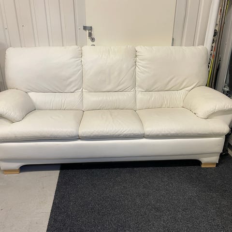 Vaalea 2-istuttava nahkasohva, valmistettu laadukkaasta nahasta. Sohvassa on pehmustetut käsinojat ja selkänojat, sopii olohuoneeseen tai muuhun oleskelutilaan. Säännöllisesti putsattu ja vahattu.