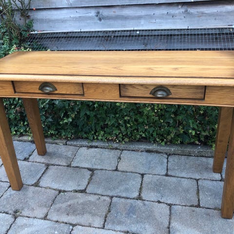 Pienikokoinen vanha sivupöytä kahdella laatikolla, leveys/syvyys 55/25cm,korkeus 50cm.