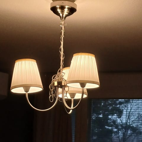 Kaunis ja virheetön valaisin viidellä lampulla. Sis. hehkulamput. Maalattua metallia/ maitolasia. 35€.
