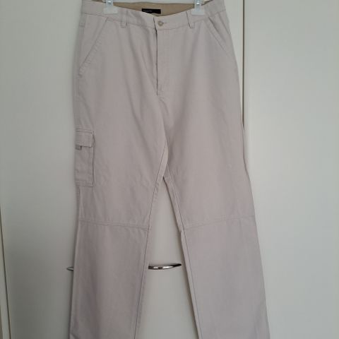 Miesten housut, koko 3XL, beige väri. Materiaali puuvillaa. Paljon yksityiskohtia. Vyö mukana. Reisitaskut. Takana myös taskut.