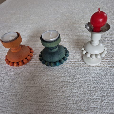 Aarikka kynttilänjalat, kolmen kappaleen setti. Materiaalina mustaksi käsitelty puu ja metallinen kynttilänpidike.